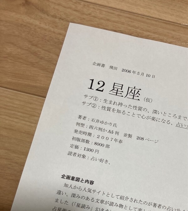 企画を通すのが大変な会社だったので、企画書の文章はちょっと鼻息荒い感じ。でも石井さんのブログの文章がすごくいいなと思って、「著者の魅力を伝えるために、オーソドックスな12星座の本を出したい」とシンプル&ピュアに企画を立てた気持ちがそこに残っていた。