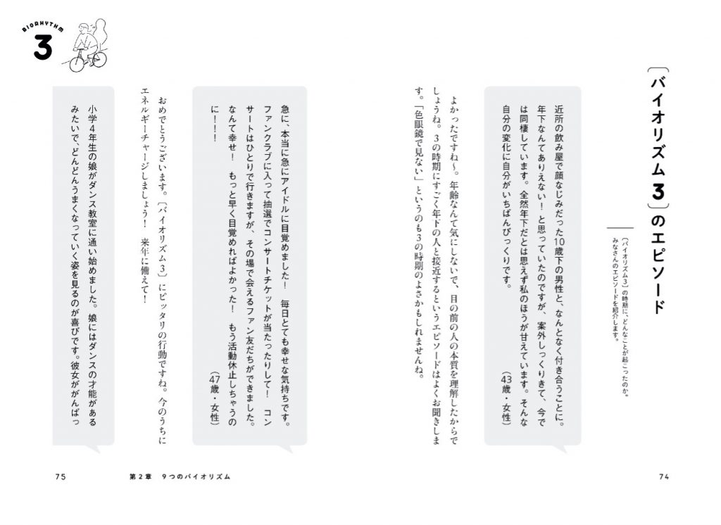 バイオリズム7と8の切り替わりがハッキリしていた方、3の時期にうっかりして手をケガしてしまったという方、9の時期にいままでやっていたことを一度すべて辞めて荷物をおろした方……。みなさんのエピソードは、こんなふうに紹介させてもらった。