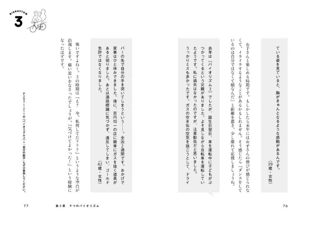 だからこそ、「各バイオリズムのときに、何が起こったのか。逆に何も起こらなかったのか」、具体的な経験を本に入れ込むことで、きっと各バイオリズムを理解する手掛かりになるし、読者の方が自分の生活と照合して楽しめるはず!!という動機からだった。